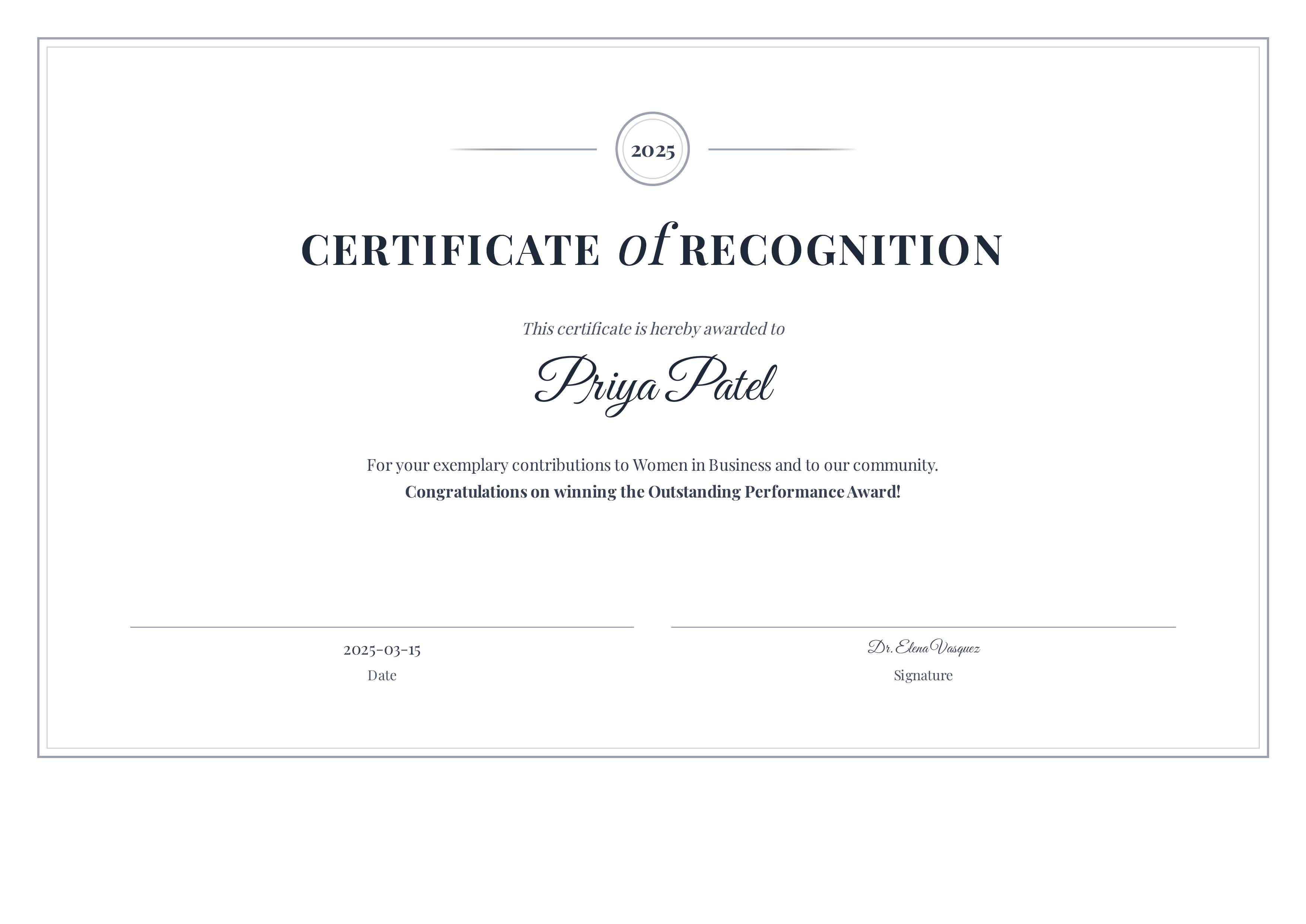 Need to honor outstanding achievements with a certificate that commands respect? This Classic Certificate of Recognition Template combines timeless design with professional sophistication. Perfect for employee recognition, community awards, volunteer appreciation, and academic achievements, it delivers the prestige your recipients deserve. Featuring an elegant double-border frame that instantly elevates presentation value, a centered decorative emblem with year display for authenticity, and premium serif typography for distinguished readability, this template makes every award memorable. The layout includes a flowing script font for recipient names that adds personal touch, customizable achievement description with bold award callout, and professional signature lines for date and authorized signatory. Ideal for businesses recognizing employee excellence, community organizations honoring volunteers, schools celebrating student achievements, and professional associations awarding certifications. The clean, formal aesthetic works beautifully for both printed certificates and digital delivery. Stop settling for generic certificates that fail to convey the significance of the achievement. Create recognition documents that recipients will proudly display for years to come.