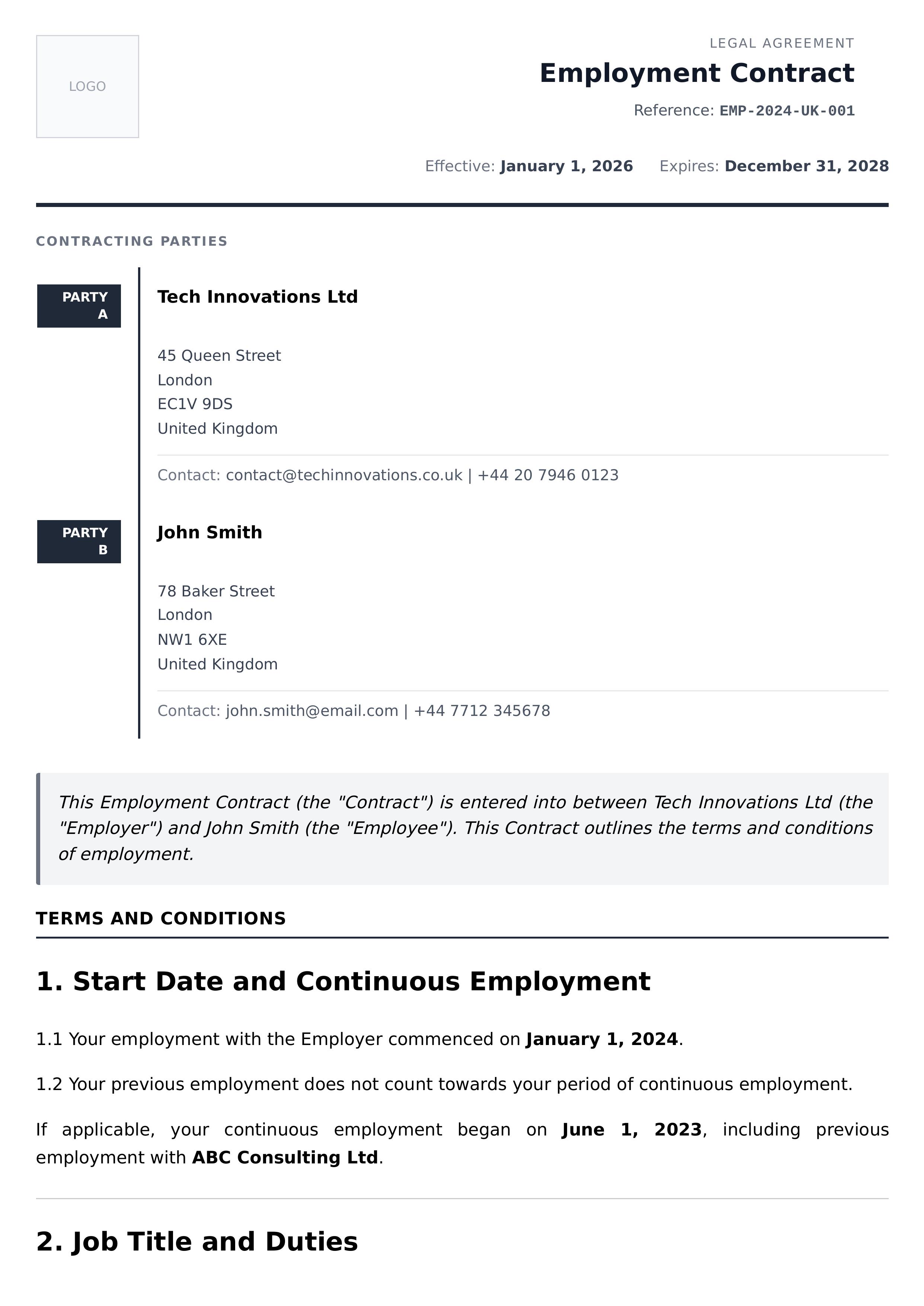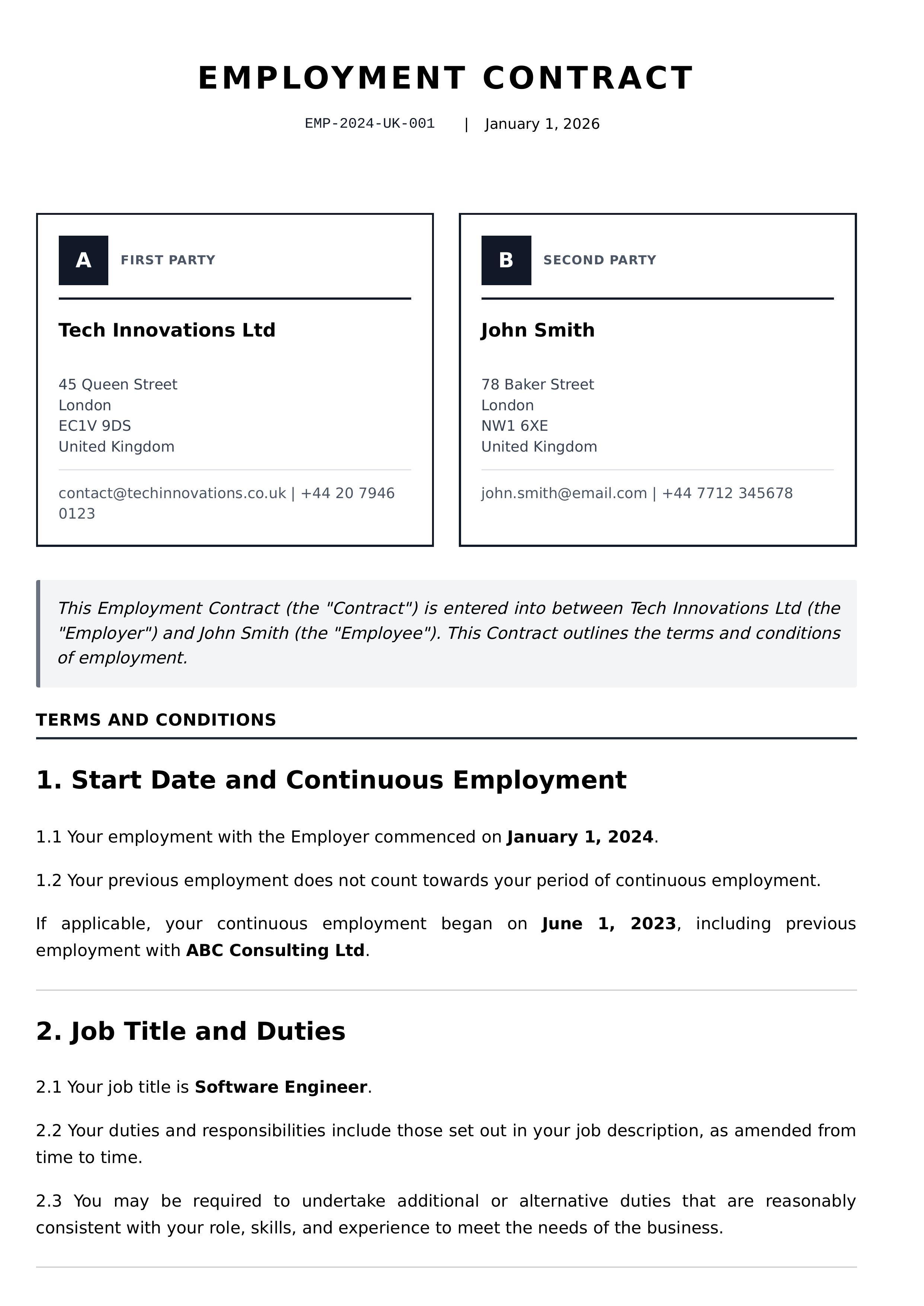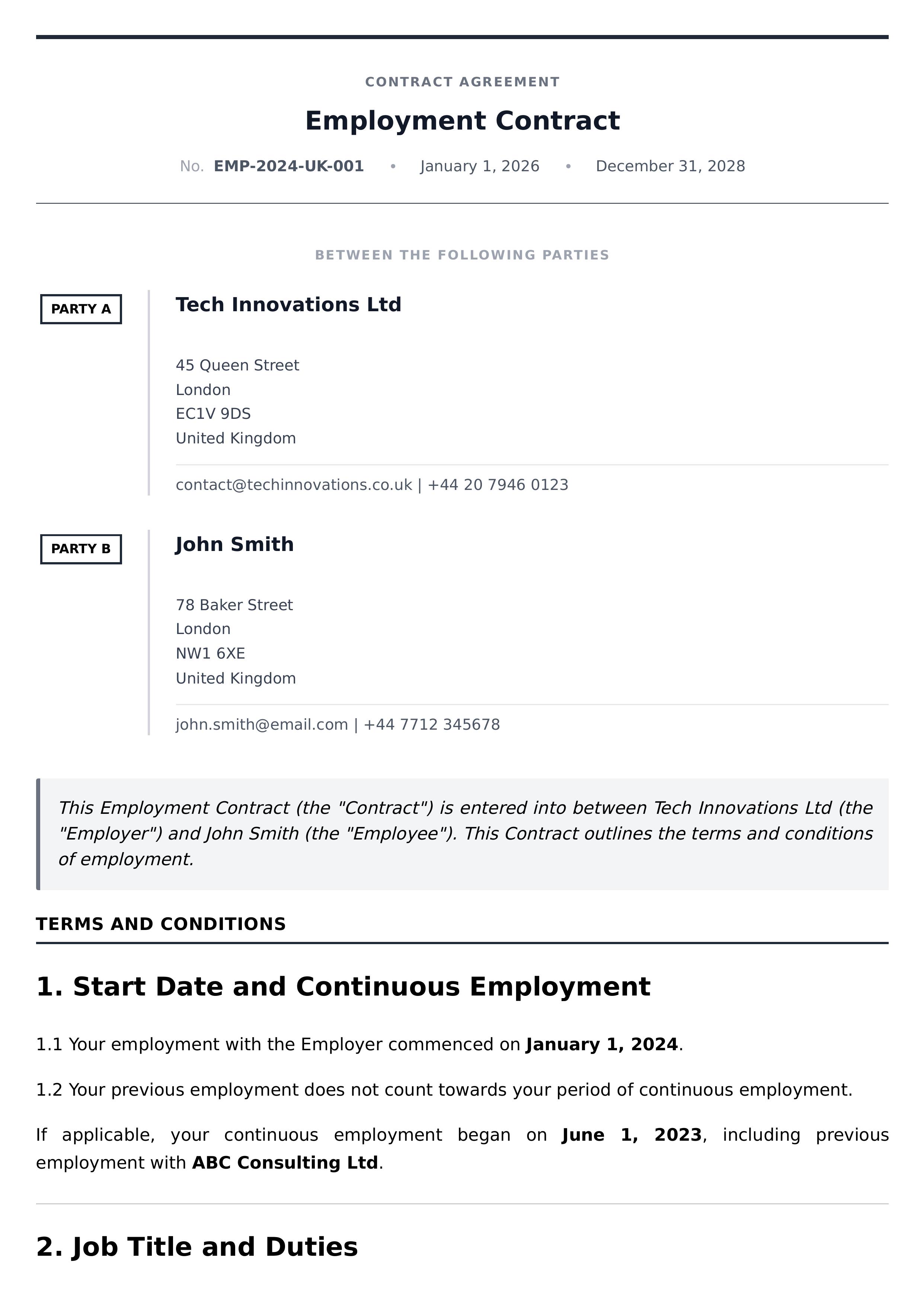 This Contract Agreement Template named Zurich Thunder Ruby is designed to help users create comprehensive contracts with clear sections for party details, terms and conditions, special provisions, and signatures. Key fields included in this template are contract title, contract number, effective and expiration dates, party A and party B details (name, address, contact information), introductions, body of terms, special terms, and signature sections for both parties and witnesses. Users can easily edit different parts of the contract using our intuitive editor, allowing full customization of text and layout. Additionally, the template supports Docmiral's convenient e-signature feature, enabling parties to sign the contract digitally for faster and legally compliant agreements. This template is ideal for professionals and businesses seeking a reliable and easy-to-use solution to draft and sign contracts without hassle.