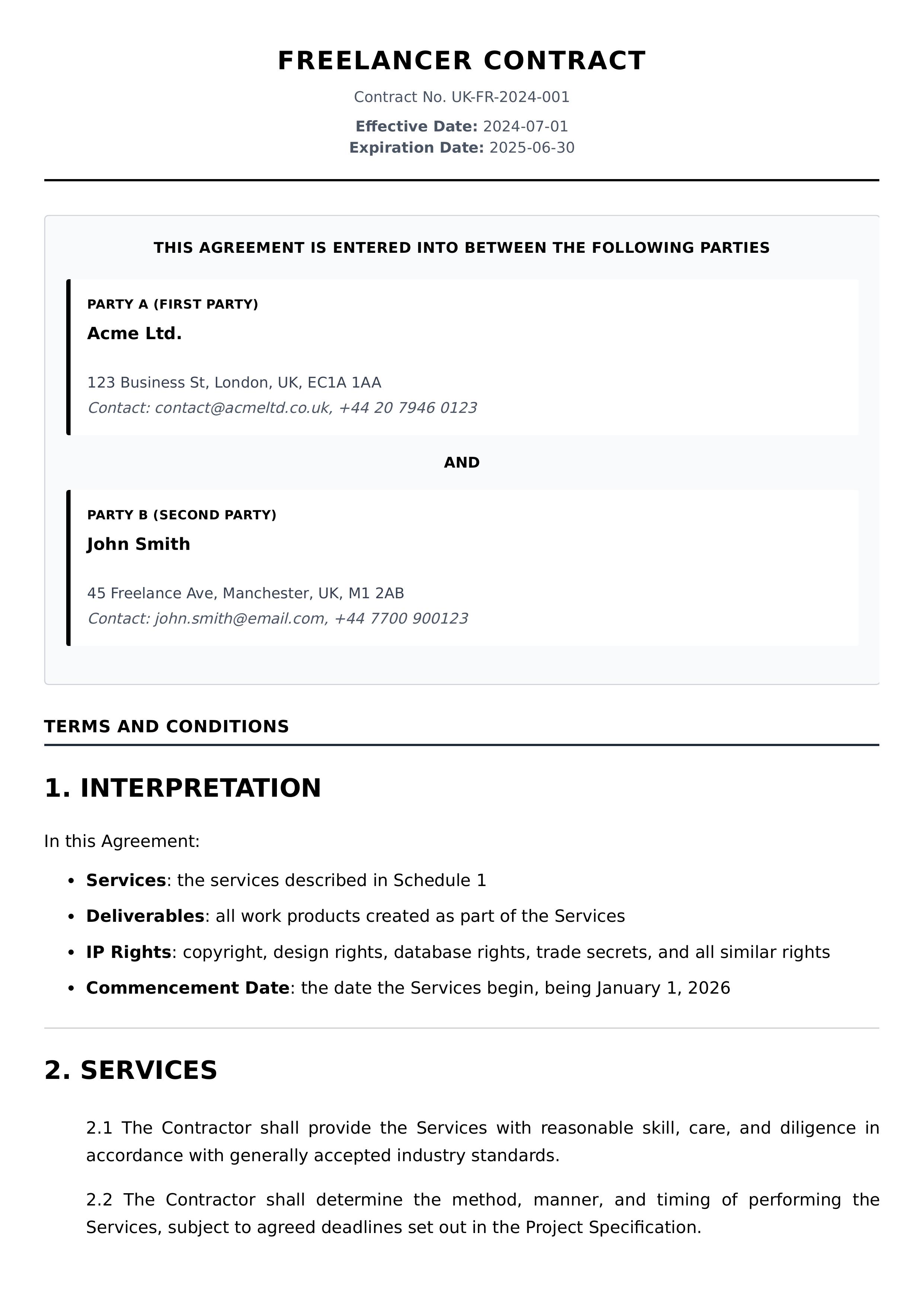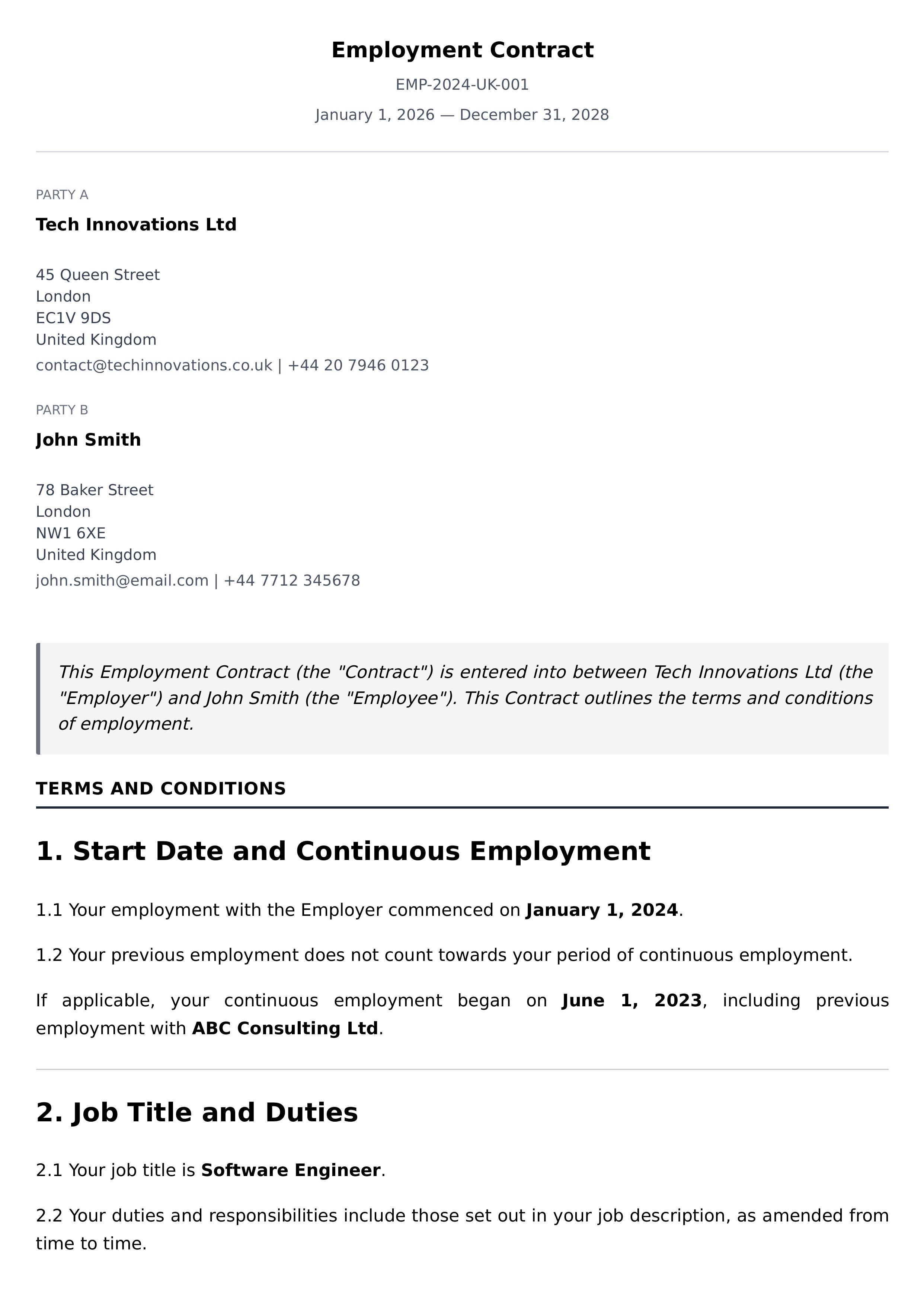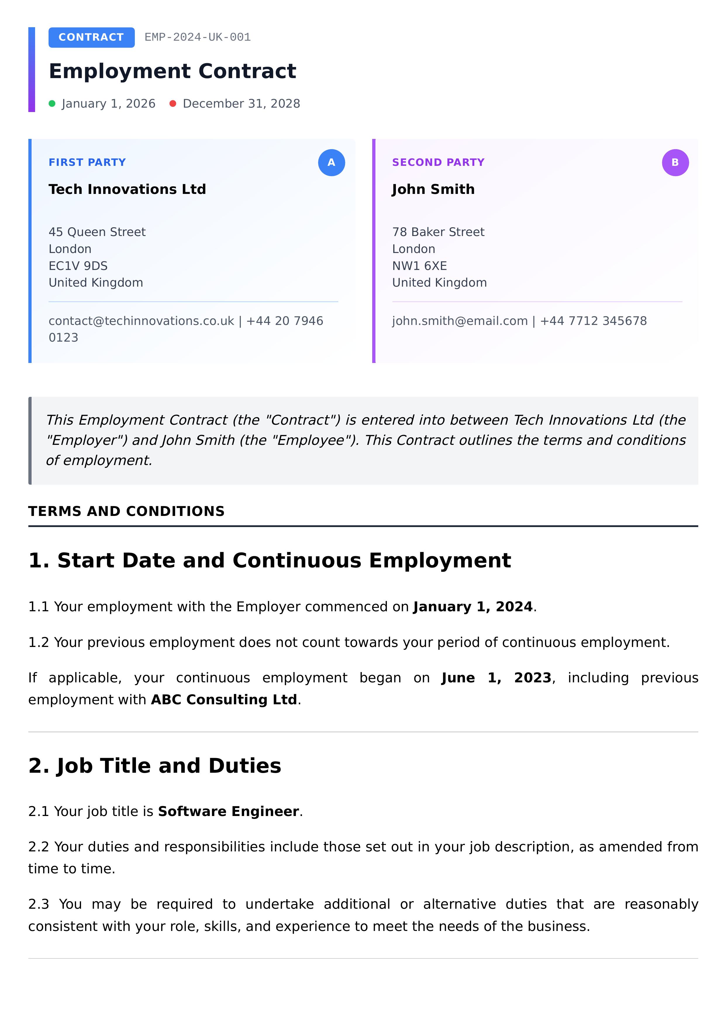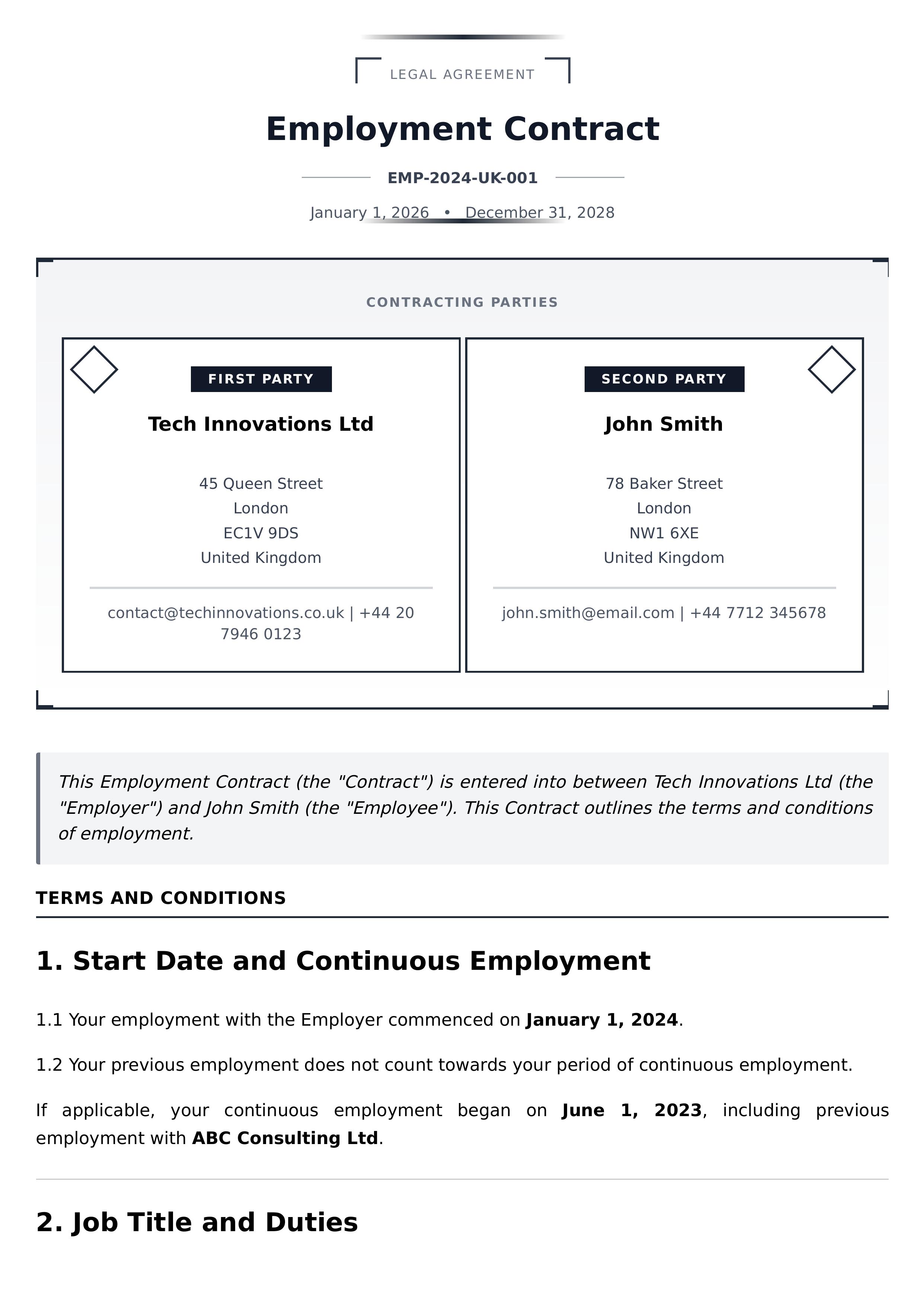 This Contract Agreement Template named Zurich Thunder Ruby is designed to help users create comprehensive contracts with clear sections for party details, terms and conditions, special provisions, and signatures. Key fields included in this template are contract title, contract number, effective and expiration dates, party A and party B details (name, address, contact information), introductions, body of terms, special terms, and signature sections for both parties and witnesses. Users can easily edit different parts of the contract using our intuitive editor, allowing full customization of text and layout. Additionally, the template supports Docmiral's convenient e-signature feature, enabling parties to sign the contract digitally for faster and legally compliant agreements. This template is ideal for professionals and businesses seeking a reliable and easy-to-use solution to draft and sign contracts without hassle.