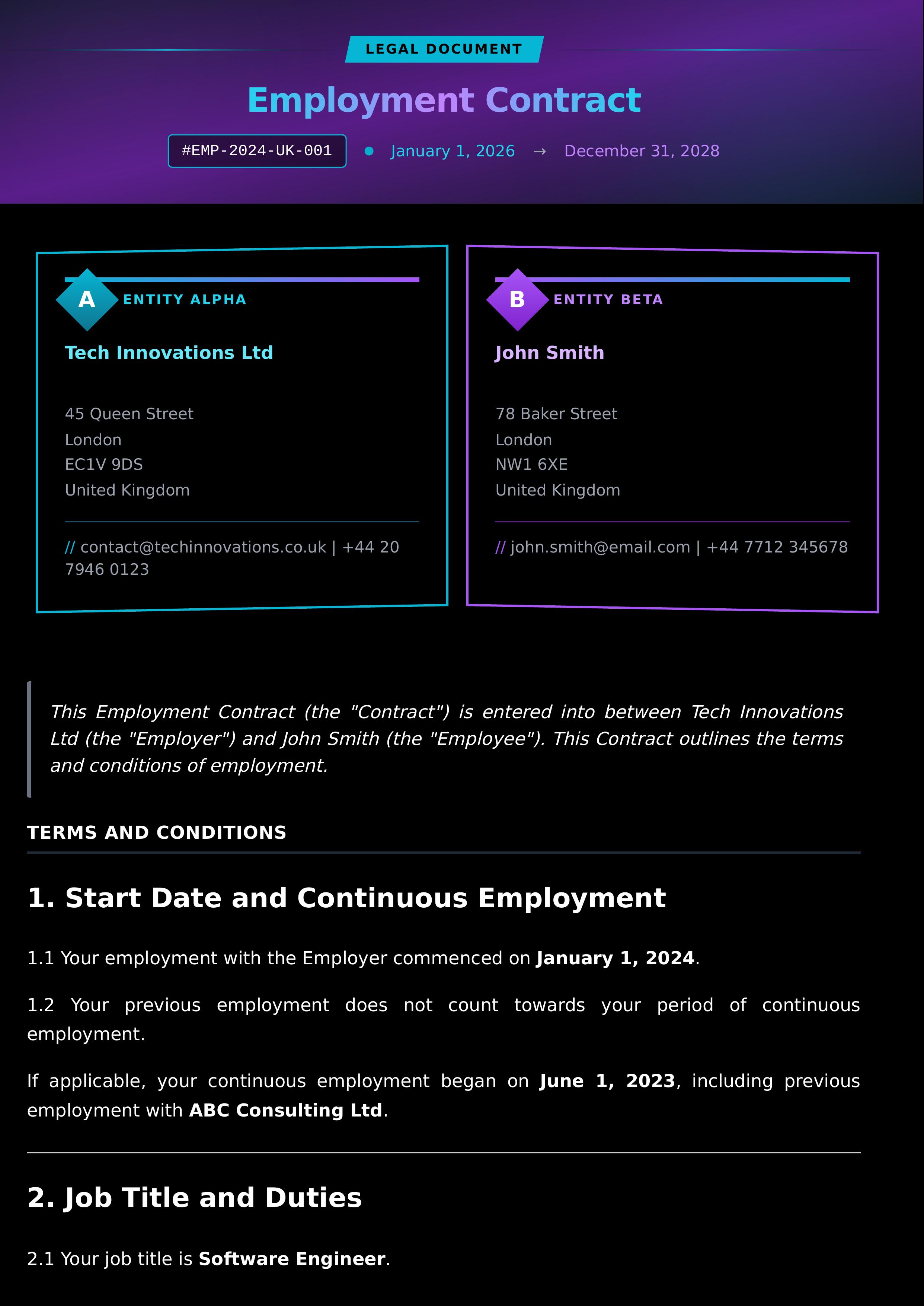 This Casablanca Summit Onyx template is designed for contracts with a modern and futuristic aesthetic suited for the modern era. It features distinct sections for parties involved, terms and conditions, special provisions, and digital authorization. You can easily edit the contract title, contract number, effective and expiration dates, party names and contacts, and signatures using our powerful yet user-friendly editor. This template also highlights the inclusion of e-signature capabilities, allowing seamless digital authorization by both parties. The editable witness and notary sections add further reliability and professionalism to your contract documents. Customizing and adjusting different parts of the contract has never been easier with our great editor and simple settings adjustments.