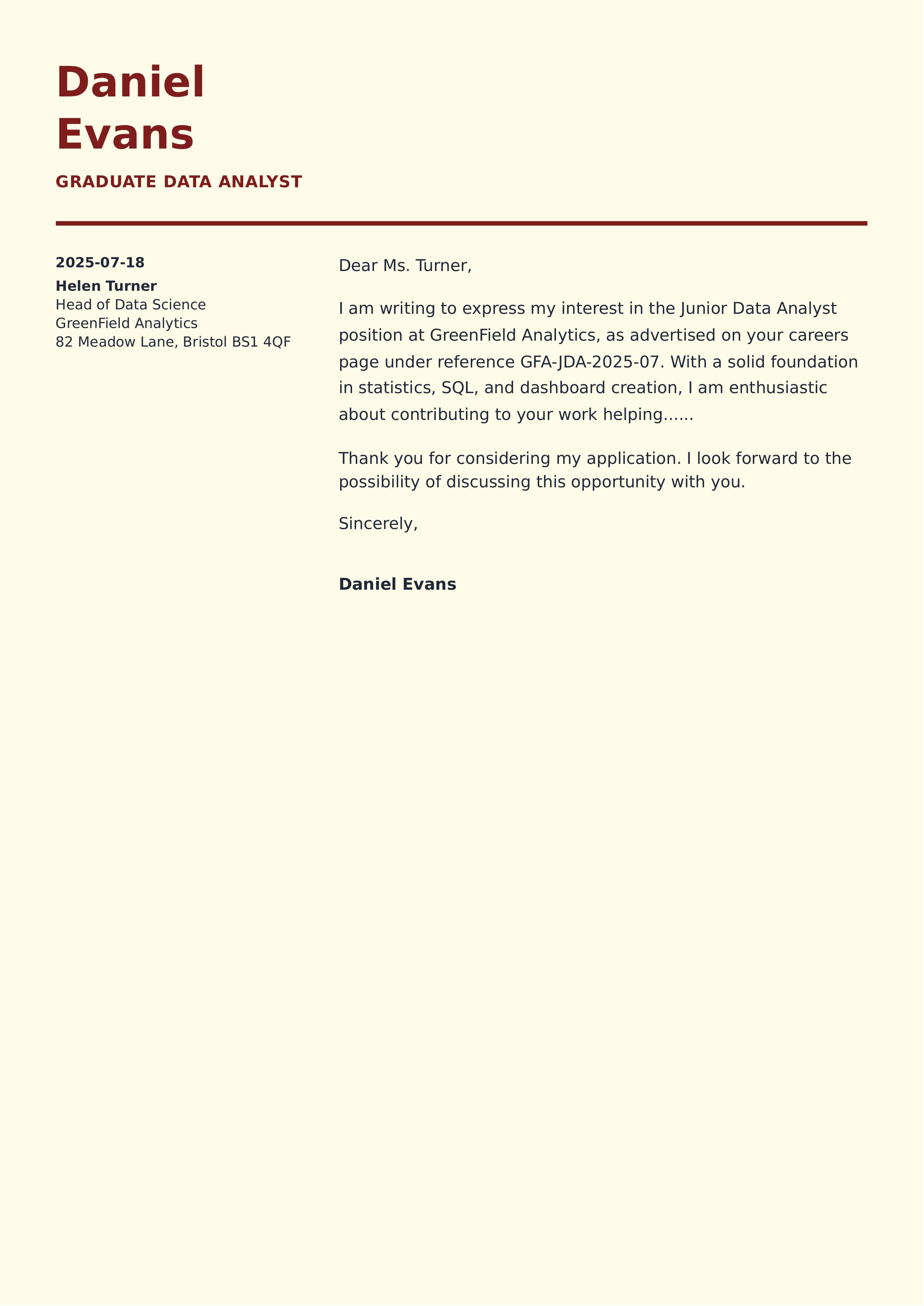 This cover letter template is designed to help job seekers across different professions create a strong and compelling application letter. It features a clean two-column layout that highlights your name, professional title, and contact details clearly for hiring managers. The template includes sections for recipient information, personalized greeting, main letter body, and a professional closing signature. The warm cream background with sophisticated accent colors creates a polished and approachable look suitable for many industries. You can easily edit and customize all parts of the template using our intuitive editor — from candidate details to letter content and recipient information. Simply fill in your details and generate an impressive, print-ready cover letter in seconds. This versatile template is perfect whether you’re applying for roles in healthcare, corporate, education, technology, or other fields, making your application stand out with professional excellence.