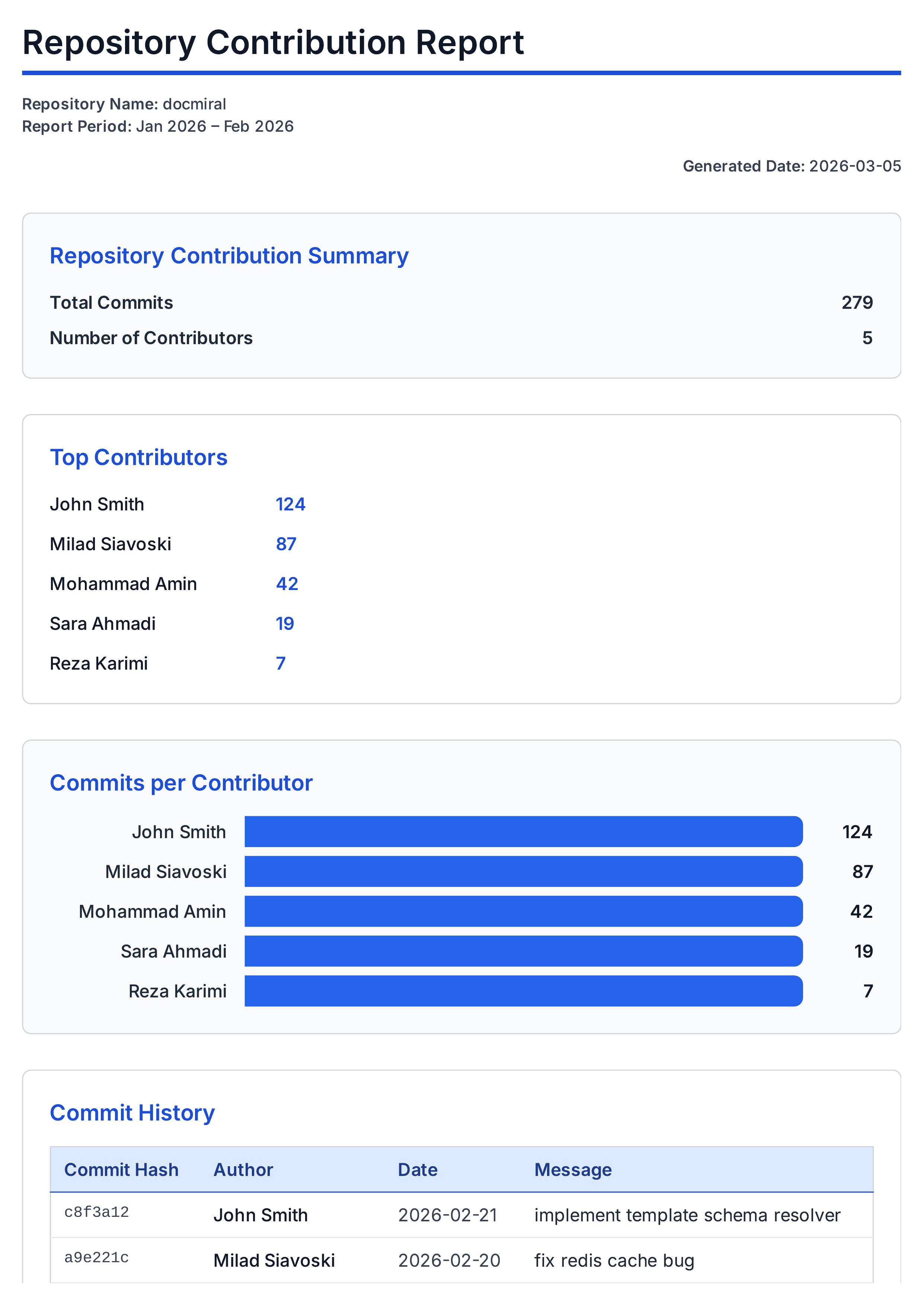 This Git Contribution Reports template helps you generate detailed insights into your repository activities. It includes editable fields for report title, repository name, report period, and the generated date. The template provides clear sections for total commits and number of contributors, showcasing the key metrics of repository involvement. It displays a list of top contributors along with their commit counts, helping you acknowledge major contributors at a glance. Visualize contributions through commits per contributor charts to better understand participation distribution. The commit history section offers a detailed table view of commit hashes, authors, dates, and messages, enabling thorough tracking of changes. Additionally, file change statistics present lines added, lines removed, and file paths to give you an overview of codebase modifications. Every part of this report is fully customizable using our user-friendly editor. You can easily adjust settings, update content, and personalize the design to match your needs, making this template a flexible tool for generating professional Git reports.