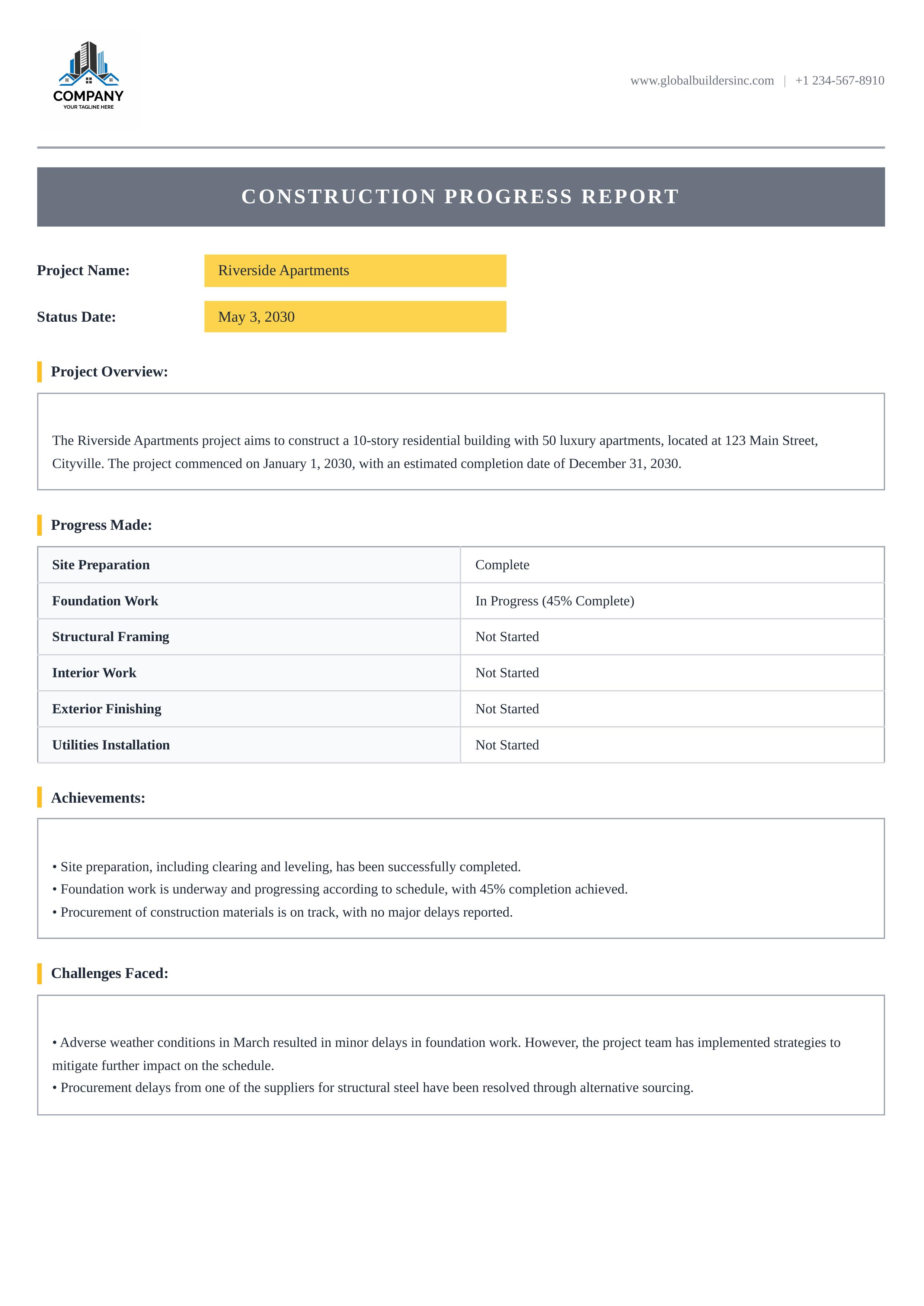 The Steel Frame Progress template features a clean professional layout with a charcoal title banner, amber-highlighted project fields, and structured sections — ideal for tracking construction project progress. Customize every aspect: company logo, contact details, project name, status date, and all report sections including overview, progress milestones, achievements, and challenges faced. The structured two-column progress table provides a clear snapshot of each milestone's completion status, while bordered text sections keep achievements and challenges organized and easy to read. With Docmiral's intuitive editor, fill in your project details, upload your company logo, and export a polished PDF report ready for stakeholder distribution — no design skills needed.