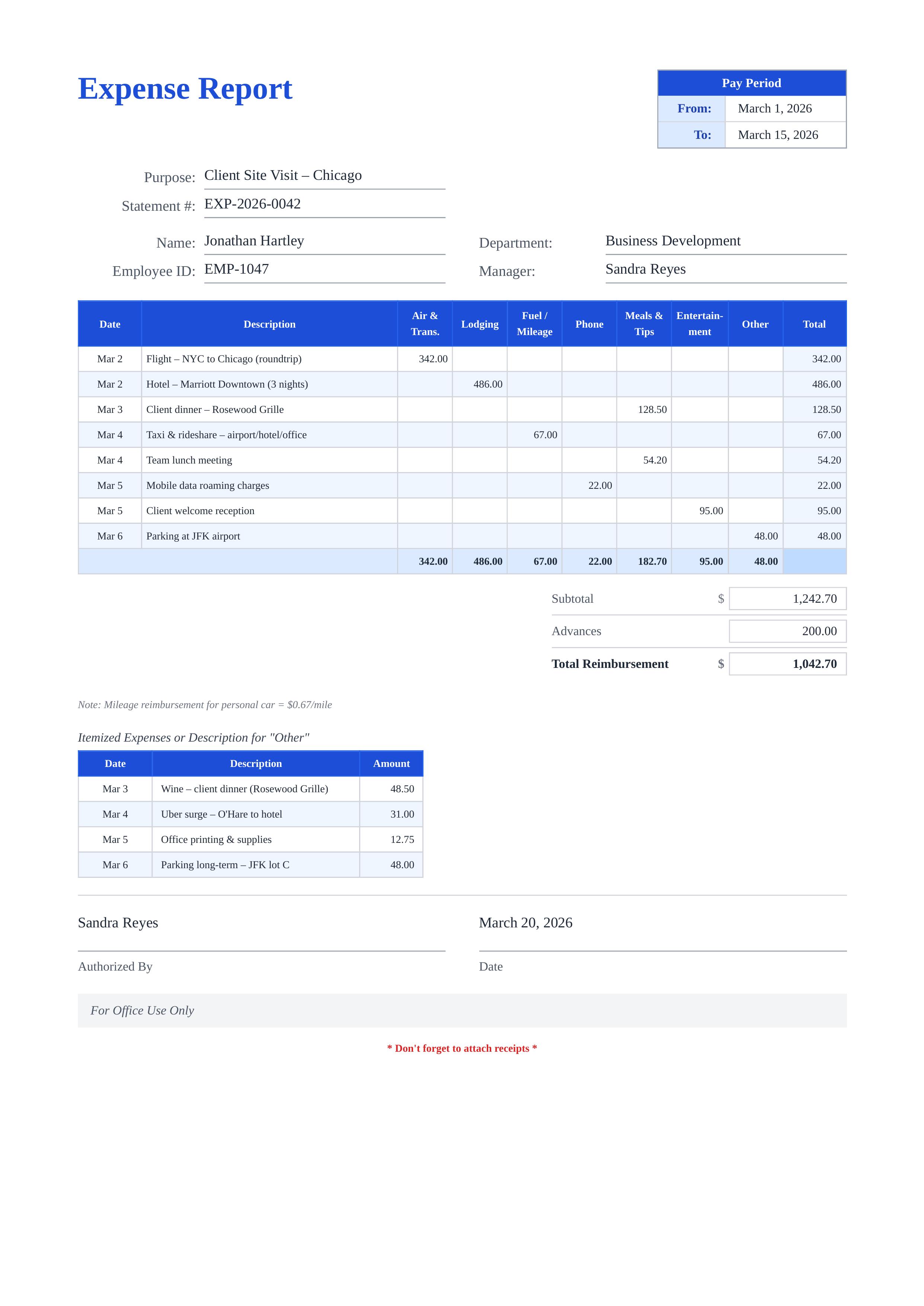 The Azure Wave Expense template features a clean, professional design with a distinctive blue header scheme. It includes organized sections for pay period, employee information, and a comprehensive multi-category expense table. Users can fully customize employee name, department, manager, statement number, pay period dates, and all expense line items including air transportation, lodging, fuel mileage, phone, meals, entertainment, and other expenses. With its structured layout and automatic subtotal and reimbursement fields, this template is ideal for corporate expense submissions, travel reimbursement requests, project cost tracking, and business travel reporting. Using Docmiral's easy editor, you can fill out your expense report in minutes, download it as a polished PDF, and submit it for approval — no design skills required.