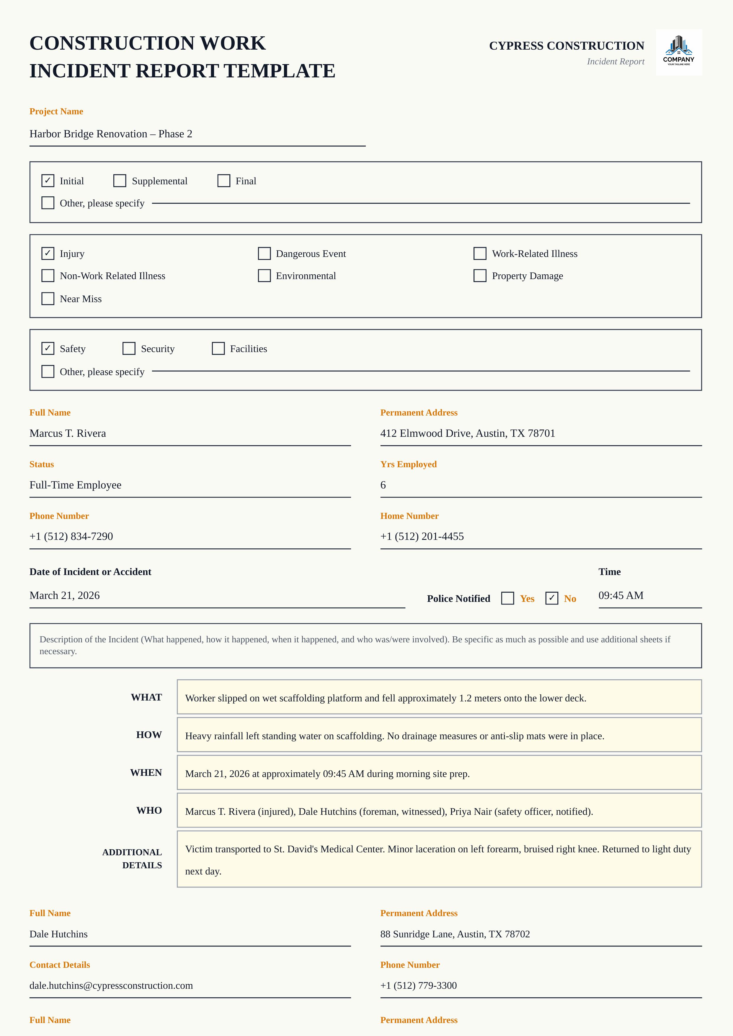 The Steel Hawk Incident report template features a clean, professional layout designed for construction sites and facility management teams. With an off-white background, amber accent labels, bordered checkbox sections, and yellow-highlighted incident description rows, it delivers a polished and structured appearance suited for safety reporting. Customize every field — report type (Initial, Supplemental, Final), incident category, department, employee details, date and time, and full incident description across WHAT, HOW, WHEN, WHO, and Additional Details sections. Visual characteristics include multi-column form fields with underline inputs, checkbox groups for classification, and a distinctive amber-on-white color scheme. Ideal for construction companies, facility managers, safety officers, and compliance teams. Powered by the Docmiral editor, this template is easy to fill out, share, and export to PDF — no design skills required.