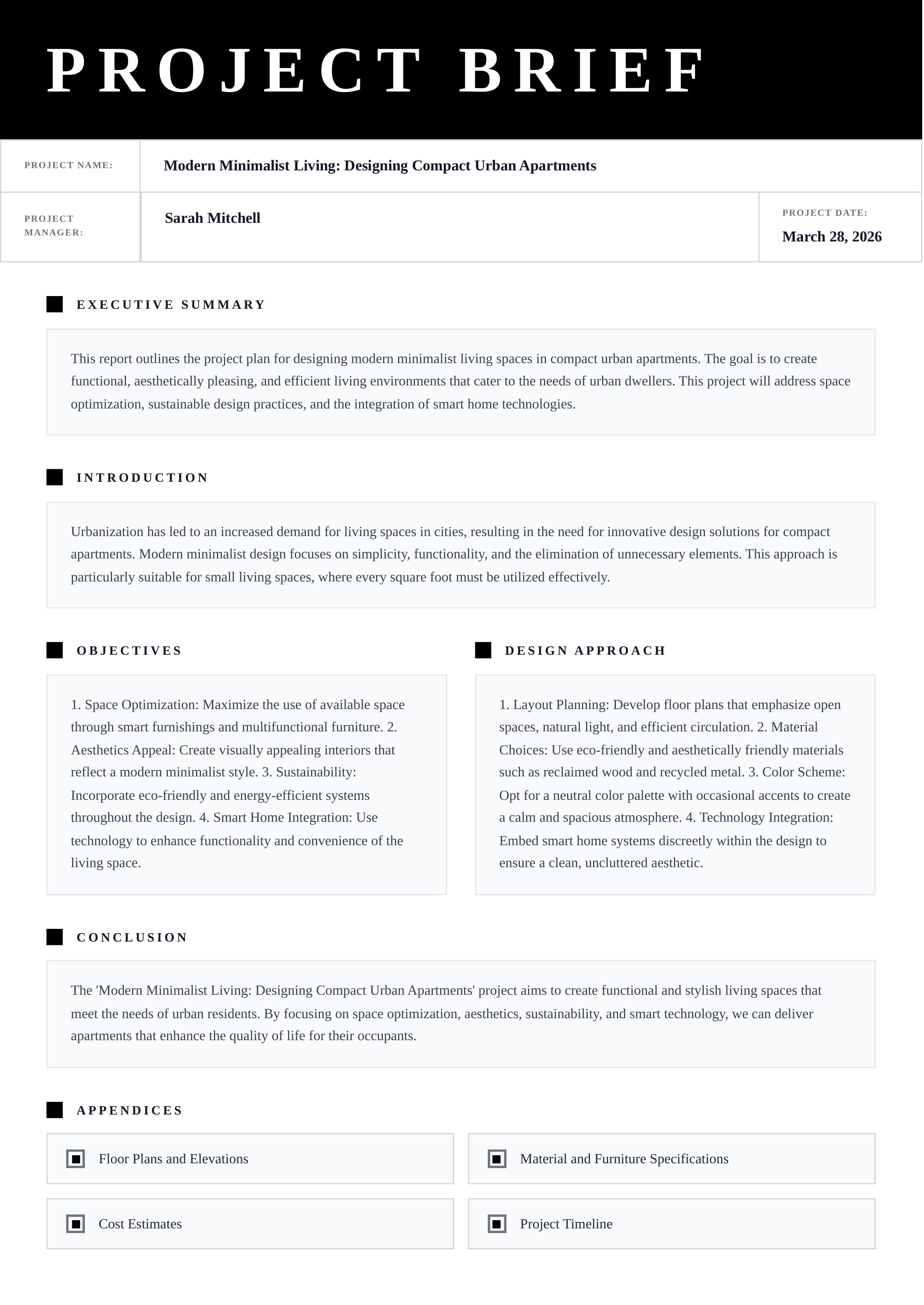 The Noir Brief Metro template features a bold black-and-white design with a striking full-width header, structured field rows, and clearly delineated sections for every stage of a project brief. Customize all key fields including project name, manager, date, executive summary, introduction, objectives, design approach, conclusion, and appendices — all fully editable via the Docmiral editor. The clean monochromatic style and two-column layout for objectives and design approach make this template ideal for architectural firms, design agencies, product teams, and corporate project managers. With Docmiral's easy-to-use editor, you can fill in your content, export to PDF instantly, and share professional project briefs with clients and stakeholders in minutes.