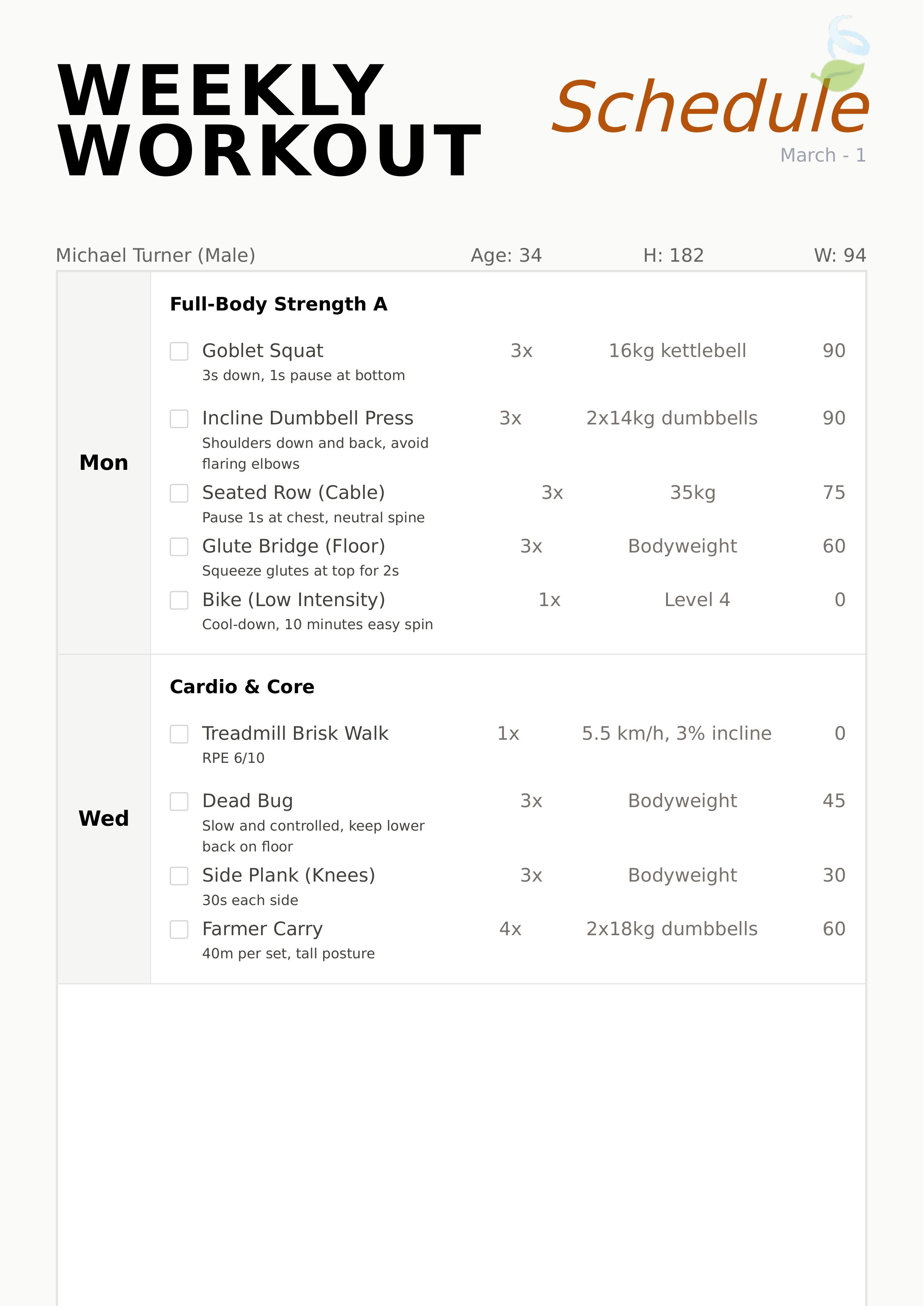 This comprehensive workout plan template is designed to help fitness enthusiasts and trainers organize weekly workout schedules effectively. It includes detailed sections for client information such as full name, gender, age, height, and weight, enabling personalized fitness tracking. The template features a clear and organized schedule table that breaks down daily exercises with titles, notes, sets, reps, weight, and rest periods, making it easy to follow and adjust your fitness regimen. Additionally, it provides spaces for coach contact details and gym information, adding professionalism and ease of communication. The clean layout uses calming stone colors with subtle decorative elements, providing an elegant and motivating visual appeal. Users can effortlessly edit different parts of the template using our user-friendly editor, allowing full customization of workout details, client data, and session schedules to fit individual needs. This template is perfect for personal trainers, fitness coaches, and anyone looking to maintain a structured and visually pleasant workout plan. Whether you need to plan monthly or weekly routines, this template helps you manage and present your fitness schedules efficiently.