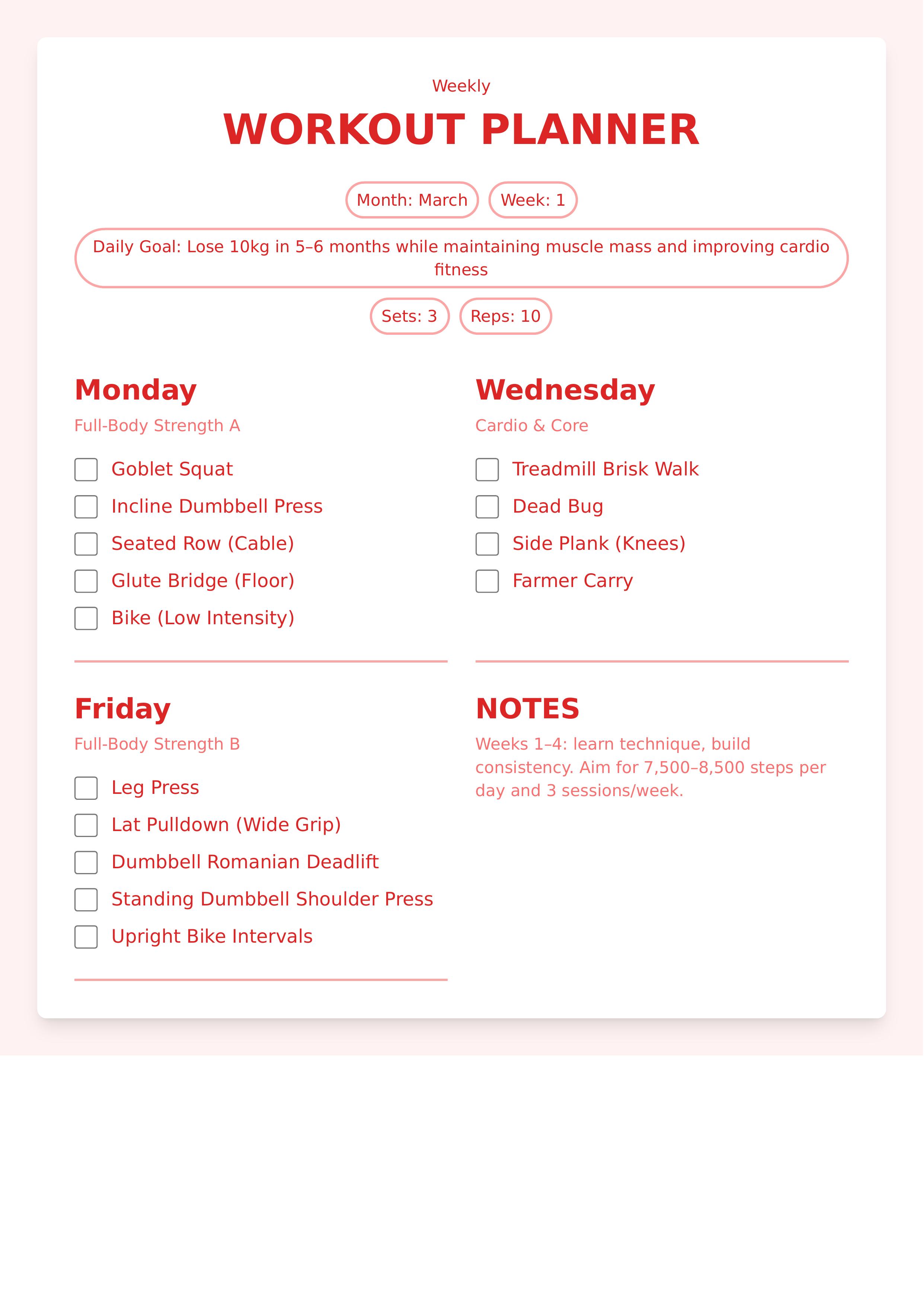 This Workout Plans Template is designed to help you organize your weekly fitness routine effectively. It features editable fields for month, week, daily goals, sets, repetitions, and detailed daily exercises. Each day includes a checklist to track your progress, making it ideal for fitness enthusiasts and trainers alike. The template uses a clean and motivating red color scheme to enhance focus and energy. You can easily customize all parts, including exercise names and notes, using our intuitive editor. It's perfect for those seeking a structured, clear, and visually appealing workout schedule that can be tailored to personal fitness goals. With dedicated sections for notes and goals, this template supports comprehensive workout planning and progress tracking. Whether you're creating personal plans or professional client routines, this template offers flexibility and ease of use to help you stay consistent and motivated in your fitness journey.
