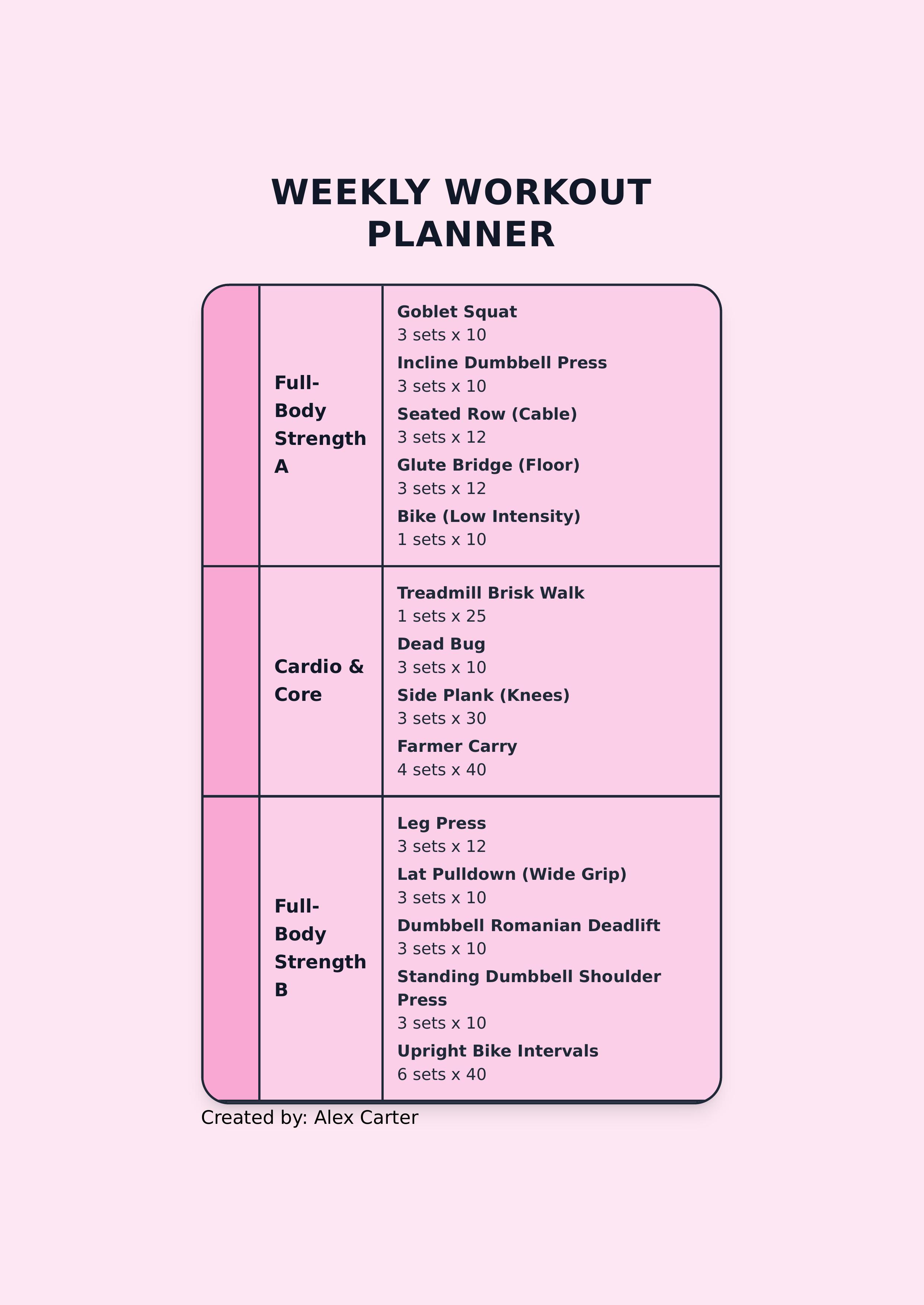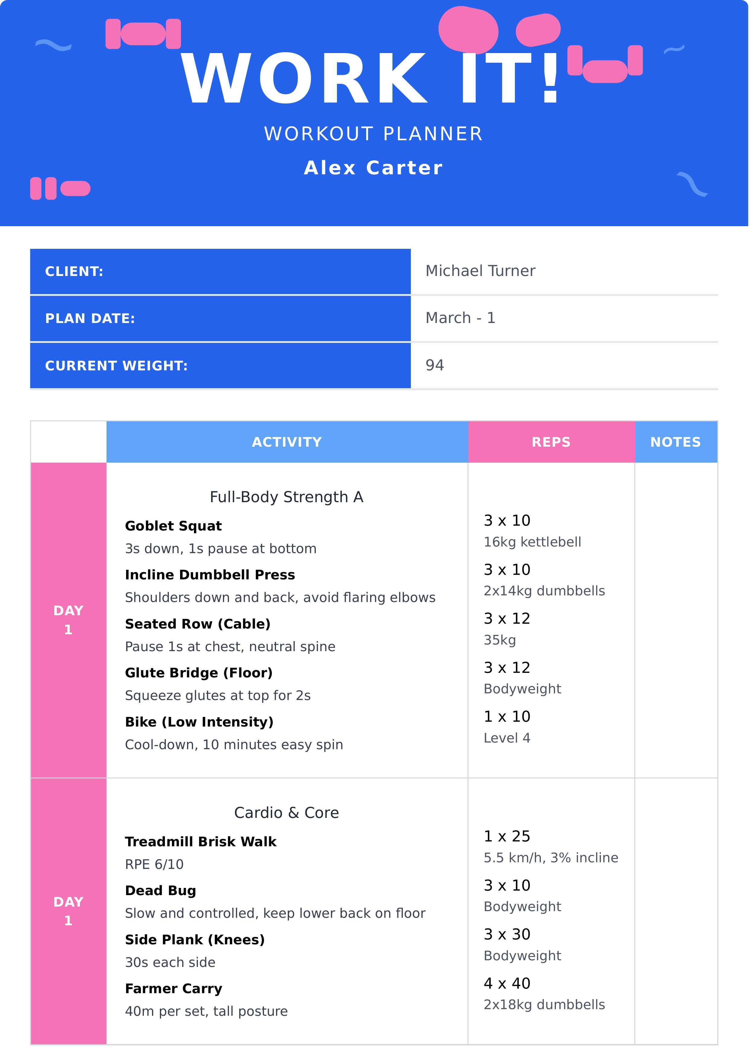 This Workout Plans template offers a structured layout for fitness coaches and clients to organize workout routines effectively. It includes key components such as client information, plan date, current weight, and a detailed workout schedule broken down by day, exercise name, sets, reps, and notes. The template features a visually appealing design with a strong blue and pink color scheme, making it engaging and motivational. Users can easily edit various parts of the template, including the coach's name, client details, workout days, and exercises using our intuitive editor. Ideal for personal trainers, gym instructors, or fitness enthusiasts who want a professional and clear workout planner that is easy to customize and track progress. This template helps to plan workouts systematically and is perfect for maintaining consistency and achieving fitness goals.