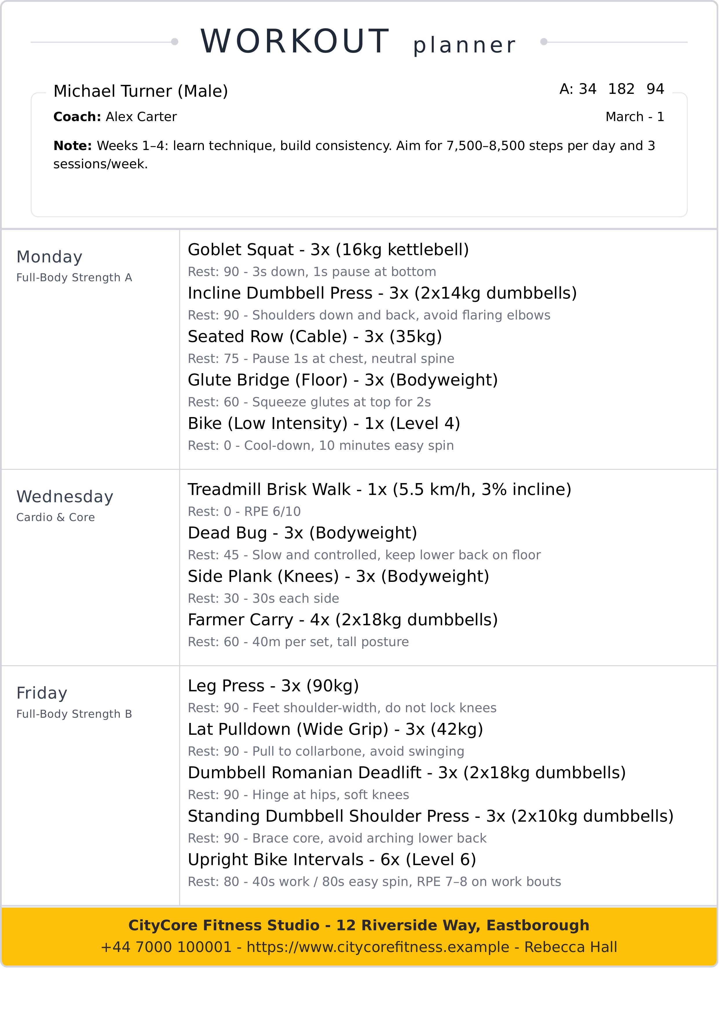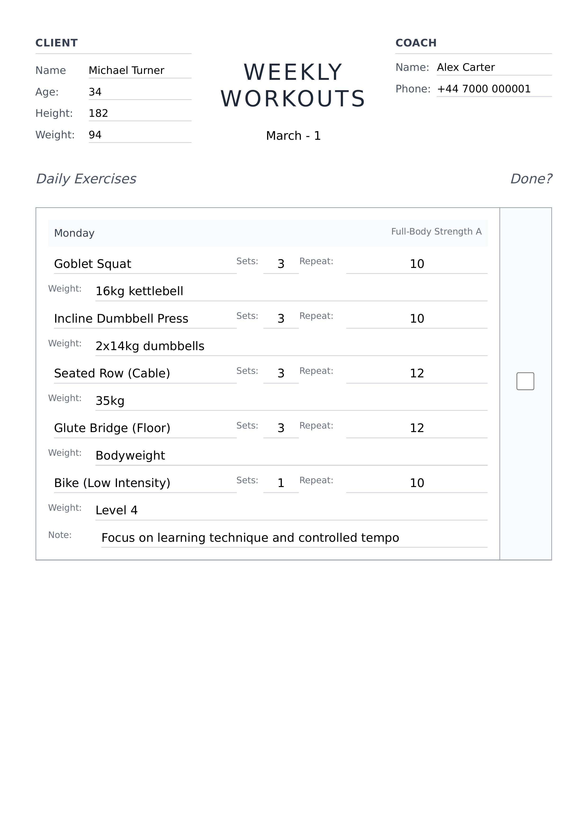 This workout plans template helps you organize and display a comprehensive weekly fitness schedule. It includes sections for client details such as full name, age, height, and weight, as well as coach information including name and phone number. The template features a clear weekly layout where you can add daily exercises with specifics on sets, repetitions, weight, and notes for each day. A checkbox allows easy tracking of completed workouts. The design uses clean and readable typography with a light color scheme focusing on clarity and usability. The layout presents information in a structured grid format that highlights daily exercise plans alongside client and coach data. The template is perfect for personal trainers, fitness coaches, or individuals who want to maintain and track workout progress. You can easily edit all parts using our powerful editor to customize names, dates, exercises, and gym information. This editable template offers a complete solution for managing and presenting workout schedules, helping users stay motivated and organized throughout their fitness journey.
