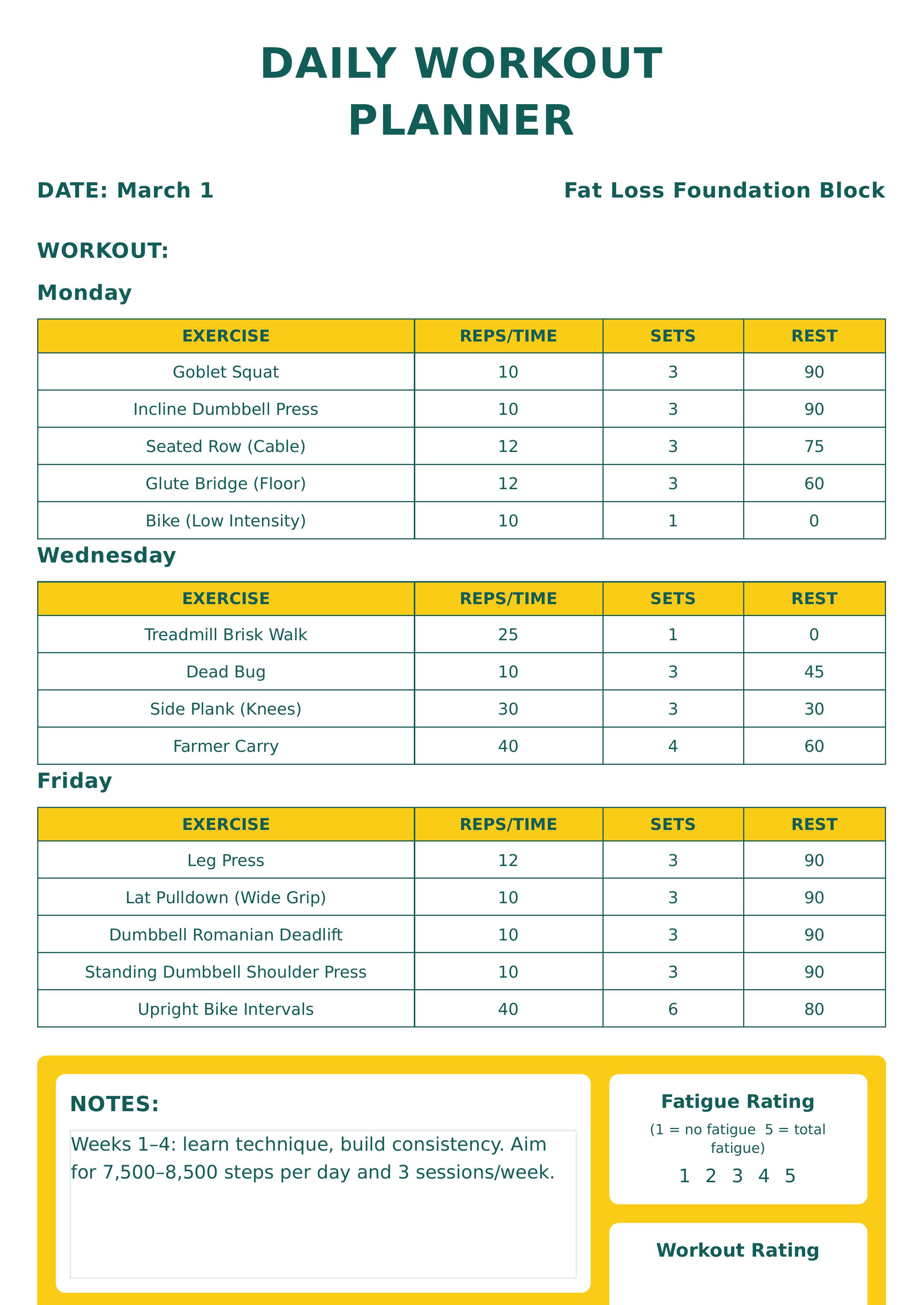This workout plans template is designed as a daily workout planner that helps you organize your exercise routines efficiently. It features sections for date, workout title, individual days with detailed tables listing exercises, reps/time, sets, and rest periods. There's also a dedicated notes area for adding additional comments or observations. The template includes fatigue and workout enjoyment rating components for tracking your physical condition and motivation levels every day. With our intuitive editor, users can easily customize all parts of this template including workout details, dates, notes, and ratings. The color scheme uses soothing teal and bright yellow highlights for clarity and visual appeal, enhancing readability and motivation. This template is ideal for fitness enthusiasts, trainers, or anyone looking to maintain a structured exercise regimen with easy tracking and personalization options. Adjustments to the layout and content can be done effortlessly without needing technical skills.