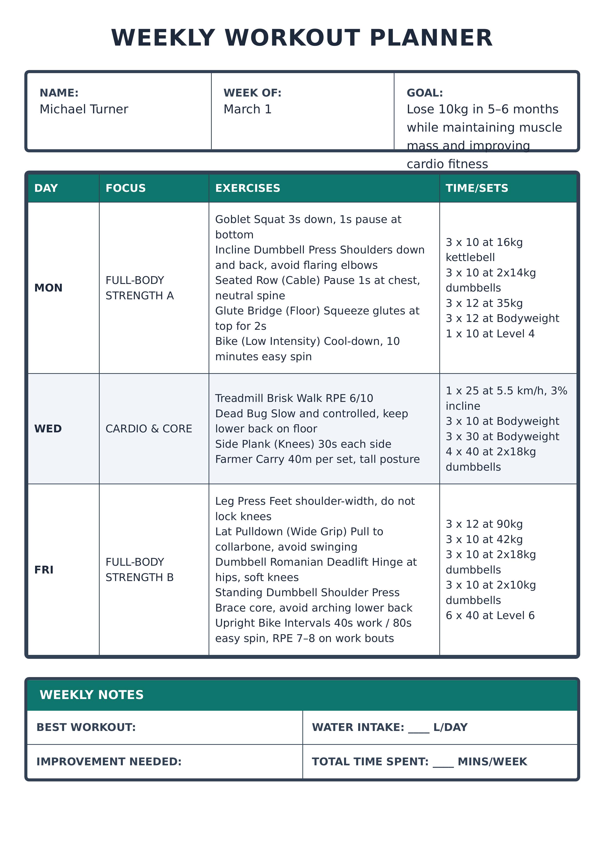 This weekly workout planner template allows you to plan and track your weekly fitness routine efficiently. It includes fields for client name, workout week, fitness goals, daily workout focus, detailed exercises with sets, repeats, and weights, as well as a section for weekly notes. The layout uses clear tables for organizing each day's workout focus and exercises, with easy-to-read sections for tracking progress and notes. The color palette includes calming teal and slate tones, providing a visually appealing and professional look. You can easily customize the template using our editor to input your details and adjust settings to suit your unique workout plan needs. This template is ideal for fitness trainers, personal coaches, and individuals who want to maintain a structured and motivating workout schedule.