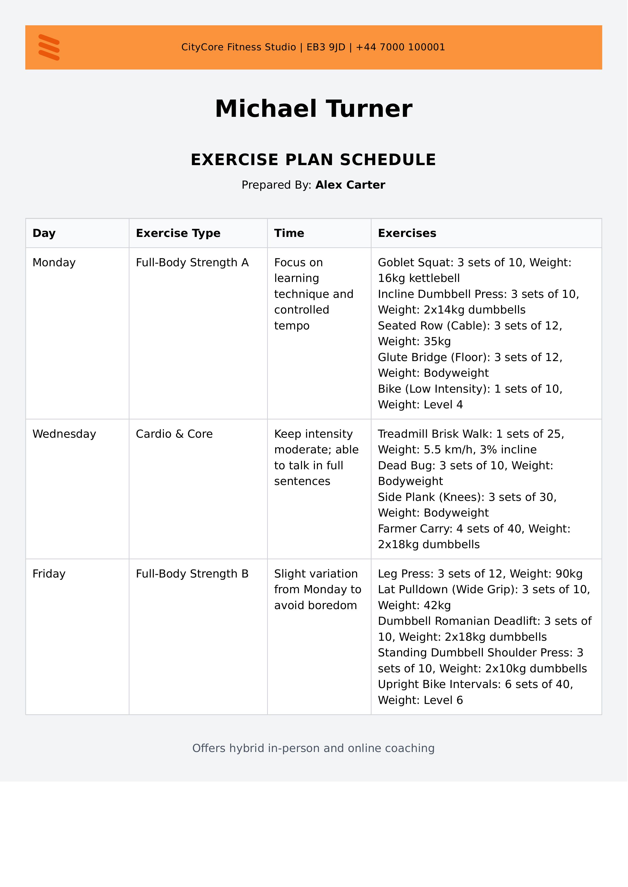 This Workout Plans Template named 'Tehran River Titan' helps you organize and present a comprehensive exercise plan schedule efficiently. It includes sections for gym contact details, client full name, and coach information, making it ideal for personal trainers and fitness coaches. The template features a detailed table to list daily exercise types, times, and specific exercises with sets and repeats. It also provides space for coach's notes. The warm orange color scheme combined with a clean layout offers an energetic yet professional look. The easy-to-edit format allows you to customize client and coach details, exercises, and schedule times effortlessly using our intuitive editor. This template is perfect for anyone looking to create professional workout plans with clear, structured schedules, ensuring clients understand their fitness routines easily.