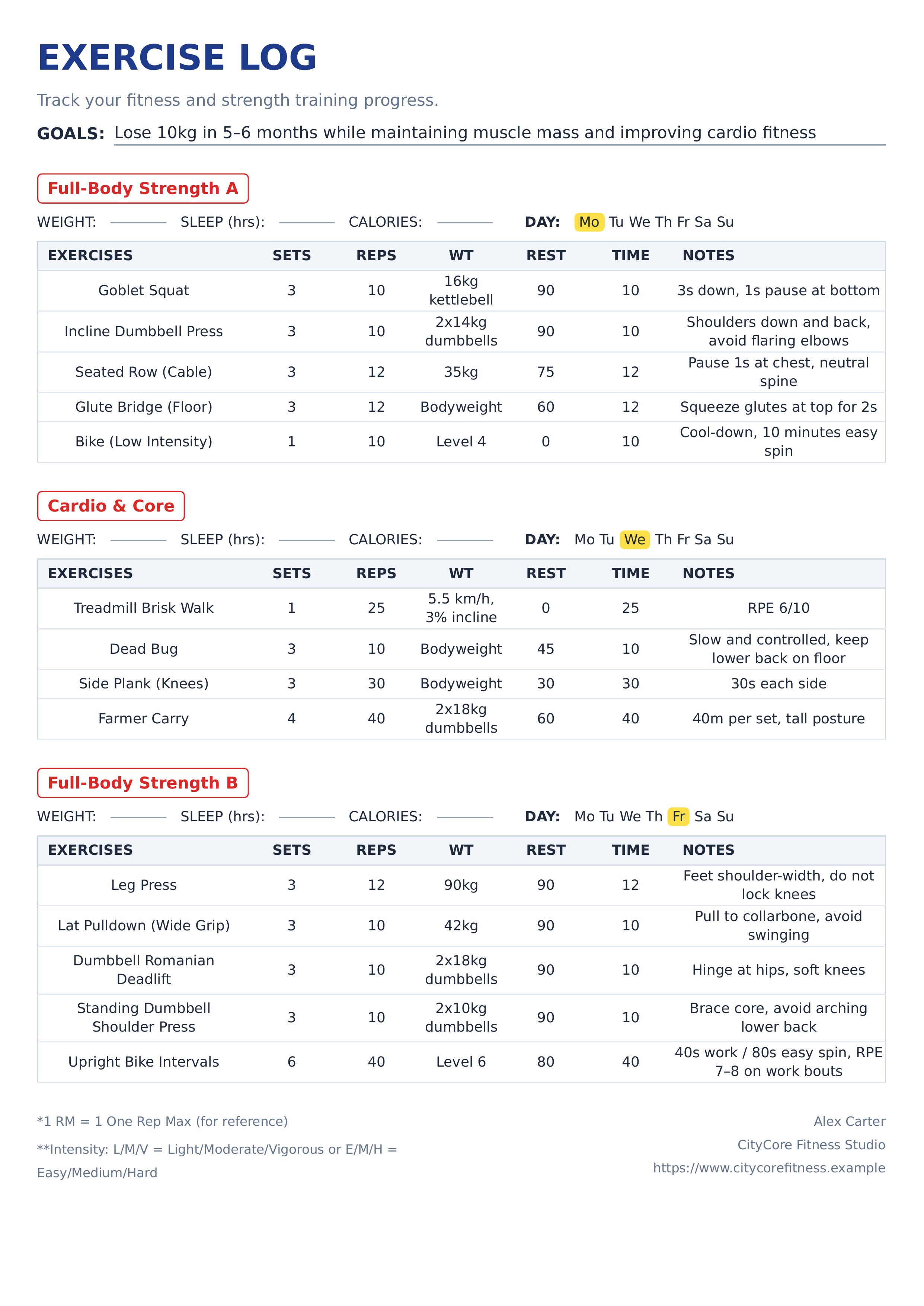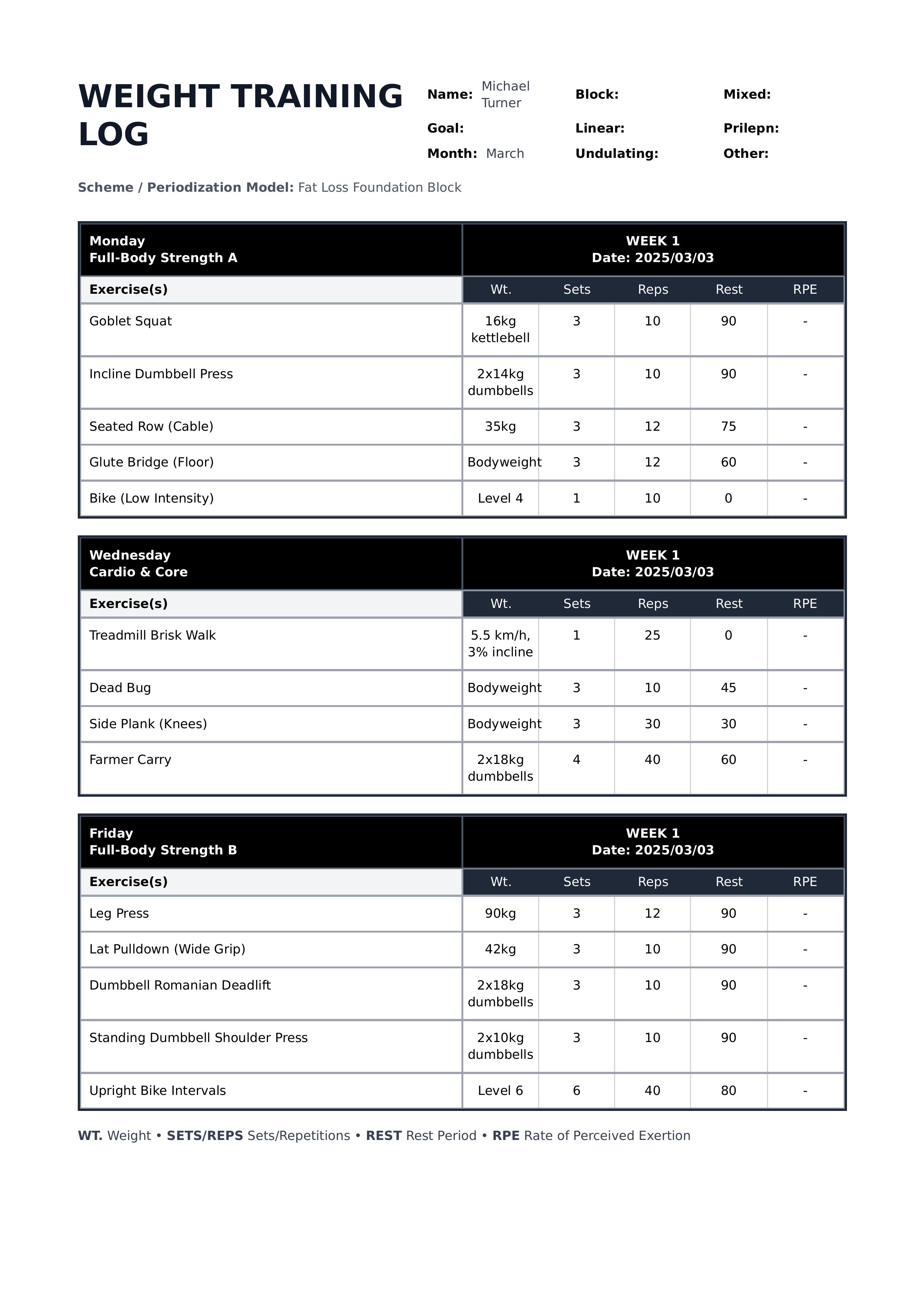 Struggling to track your strength training progress across multiple workout days? This professional weight training log template brings structure and accountability to your fitness programming. Designed specifically for personal trainers, strength coaches, powerlifters, and serious gym-goers, this template delivers a comprehensive monthly tracking system. The clean black-and-white layout features dedicated blocks for up to four different workout days or muscle groups, each with a 4-week progression grid. Track essential training variables including weight, sets, reps, rest periods, and RPE (Rate of Perceived Exertion) across multiple weeks to monitor progress systematically. What makes this weight training log stand out is its practical workout-focused design. Each workout block includes exercise names, customizable periodization checkboxes (Block, Linear, Undulating, Prilepn), and space for scheme notes. The structured grid format makes it simple to spot progression patterns, identify plateaus, and adjust programming based on real data. Perfect for documenting strength blocks, hypertrophy phases, or power development cycles. Ideal for certified personal trainers creating client programs, strength and conditioning coaches managing athlete periodization, powerlifting and Olympic lifting athletes tracking training blocks, and fitness enthusiasts following structured progressive overload programs. Generate print-ready PDFs instantly with room for client names, monthly planning, and detailed exercise progressions. The organized 4-week format ensures you never lose track of important training data. Stop using scattered notebooks and generic spreadsheets. Start building strength systematically with this coach-approved weight training log that turns raw workout data into measurable progress.