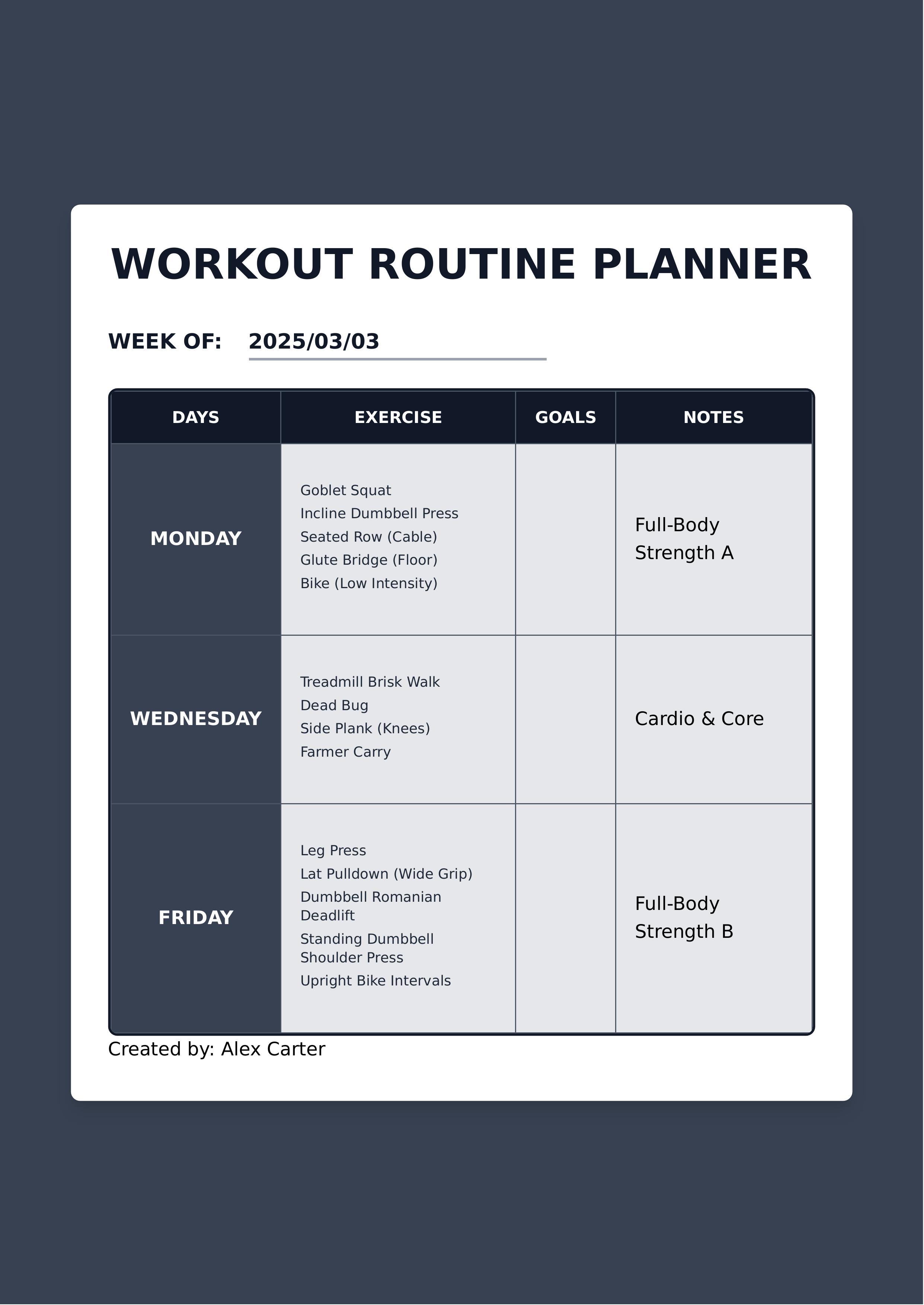 Need a simple way to plan your workouts for the entire week? This weekly workout routine planner template brings organization and clarity to your fitness schedule. Designed for busy individuals, fitness enthusiasts, personal trainers, and gym-goers, this template offers a straightforward 7-day planning system. The clean layout features dedicated columns for Days, Exercise, Goals, and Notes, making it easy to map out what you'll do each day of the week. Write your week-at-a-glance fitness plan and keep yourself accountable with a visual weekly overview. What makes this workout planner effective is its simplicity and versatility. Unlike complex training logs, this template focuses on planning rather than tracking metrics. The spacious cells give room for exercise names, specific fitness goals for each day, and important notes about modifications or focus areas. Whether you're planning strength training, cardio sessions, yoga days, or recovery work, the flexible format adapts to any fitness routine. Perfect for personal trainers creating client weekly plans, fitness coaches organizing group training schedules, individuals establishing consistent workout routines, busy professionals fitting fitness into their schedule, and beginners starting their fitness journey. Generate print-ready PDFs instantly with room for week dates, exercise descriptions, personal goals, and session notes. The organized format ensures consistency and helps prevent missed workouts. Stop writing workouts on random paper. Start planning your fitness week strategically with this professional weekly workout planner that turns good intentions into structured action.
